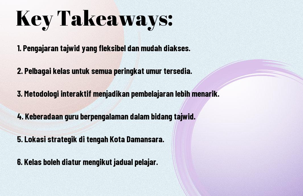 Di Kota Damansara, anda akan mendapati pelbagai lembaga pendidikan yang menyediakan program-program khusus berkaitan tajwid. Hal ini tentunya menjadi satu kelebihan bagi anda yang ingin mempelajari teknik-teknik tajwid dengan lebih berkesan. Struktur pengajaran di lembaga-lembaga ini dirangka secara sistematik, membolehkan anda mempelajari setiap aspek dengan lebih mudah dan teratur.