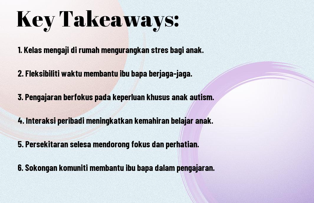 Kelas mengaji di rumah membawa banyak kelebihan kepada anak-anak autism. Dengan suasana yang selesa dan keluarga di sekeliling, anak-anak dapat belajar tanpa tekanan. Anda sebagai ibu bapa dapat mengawal persekitaran pembelajaran, membolehkan anda menyesuaikan pendekatan mengajar mengikut kehendak dan kemampuan anak. Ini juga membantu mengukuhkan hubungan antara anda dan anak, sambil memberikan mereka perhatian yang mereka perlukan semasa proses pembelajaran.