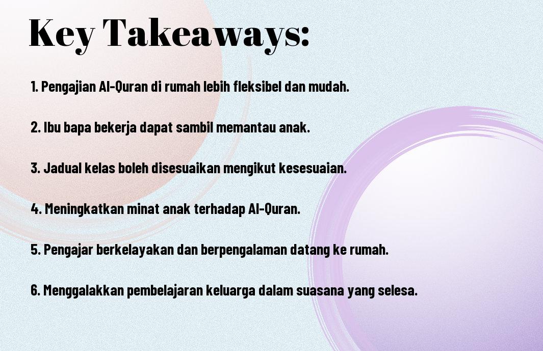 Dalam dunia yang semakin sibuk ini, saya memahami betapa menyusahkan bagi anda sebagai ibu bapa bekerja untuk menyediakan pendidikan agama yang berkualiti untuk anak-anak. Oleh itu, saya ingin berkongsi tentang manfaat kelas mengaji ke rumah, yang bukan sahaja memudahkan anda, tetapi juga memberikan keselesaan bagi anak-anak di persekitaran yang mereka kenali. Kelas ini memberikan pengajaran secara individu dan membolehkan anda menyesuaikan waktu belajar dengan rutin harian keluarga anda. Mari kita tinjau lebih lanjut tentang kelebihan pilihan ini!