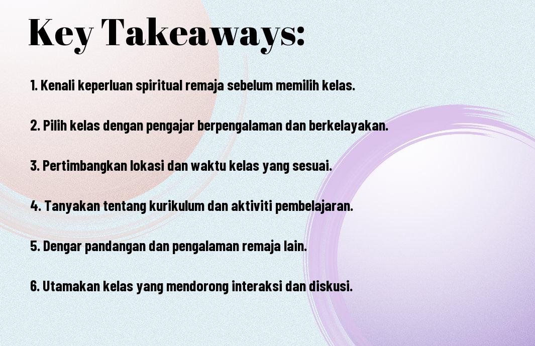Dengan memilih kurikulum yang sesuai, anda bukan sahaja memberikan pengetahuan agama tetapi juga membantu remaja membangun karakter dan keperibadian yang baik. Kurikulum yang melibatkan nilai-nilai moral dan etika akan membekalkan remaja dengan alat untuk menghadapi cabaran sosial dan moral di dunia ini. Oleh itu, saya sarankan anda untuk meneliti berbagai pilihan kelas agama yang ada dan memastikan kurikulumnya selaras dengan aspirasi dan nilai-nilai yang ingin anda tanamkan kepada remaja.